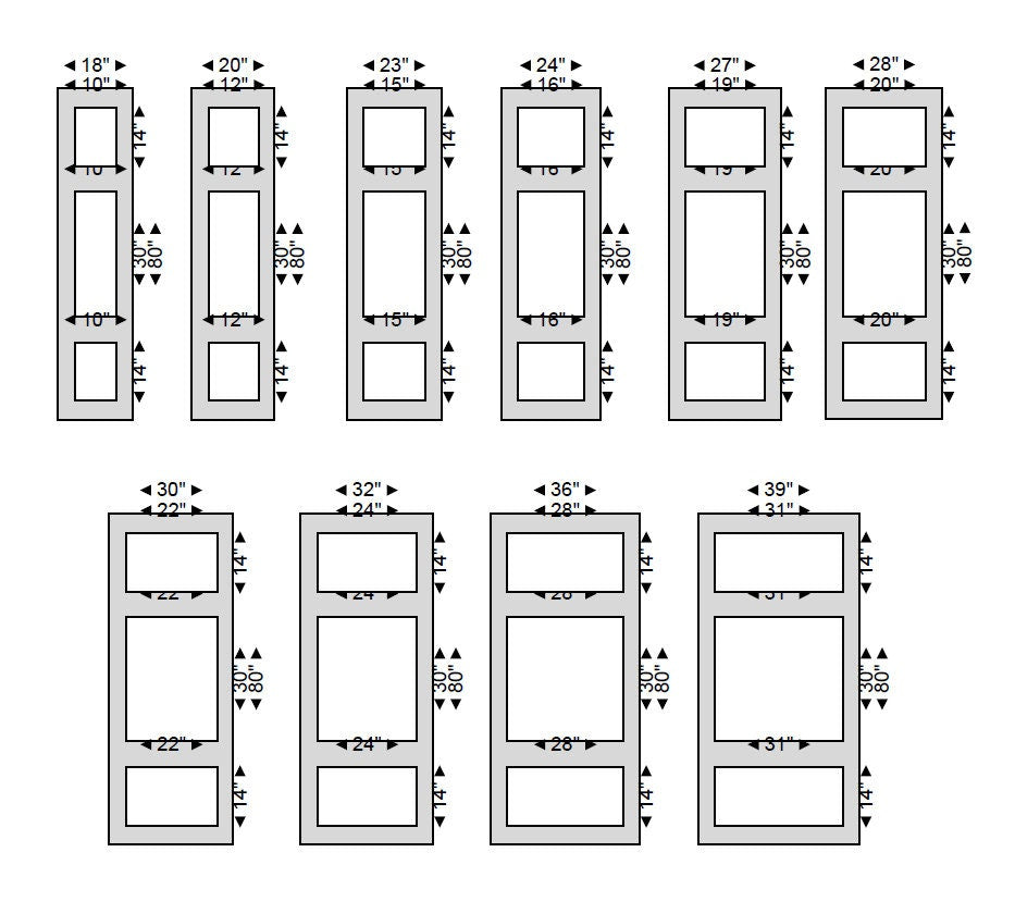 This product includes three panels for one door. Choose between 18", 20", 23", 24", 27", 28", 30", 32", 36", 39" width of the door. Choose the width and the style of the trim as well (4 cm, 3 cm or 2.6 cm). The measurements are shown in the photos in the listing.