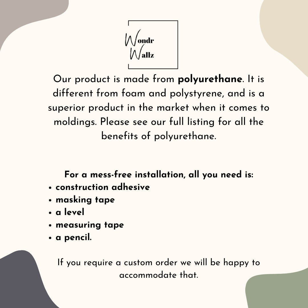 Transform your living space with confidence using our Polyurethane Molding Kits – where style meets durability. Unleash the artist in you and create a home that speaks to your taste. Thank you for choosing WondrWallz for your home decor endeavors! Should you have any questions or customization requests, feel free to reach out.