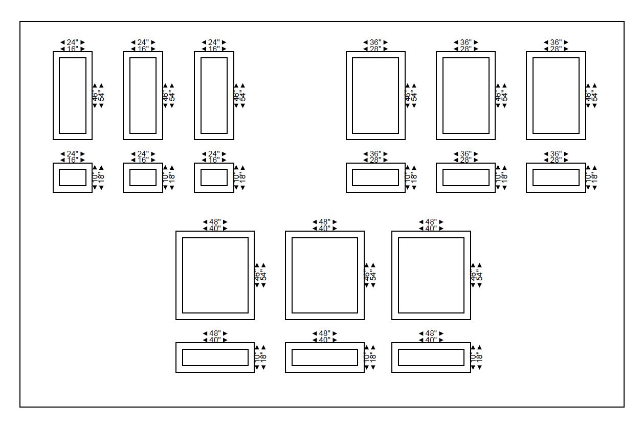 This product includes six double-framed panels: three double-framed upper boxes and three double-framed lower boxes. Choose between 24", 30", 36", 42", 48", 54" width of the panels. The width of the outer trim is 4 cm, and the inner is 2.6 cm. The measurements are shown in the photos in the listing.